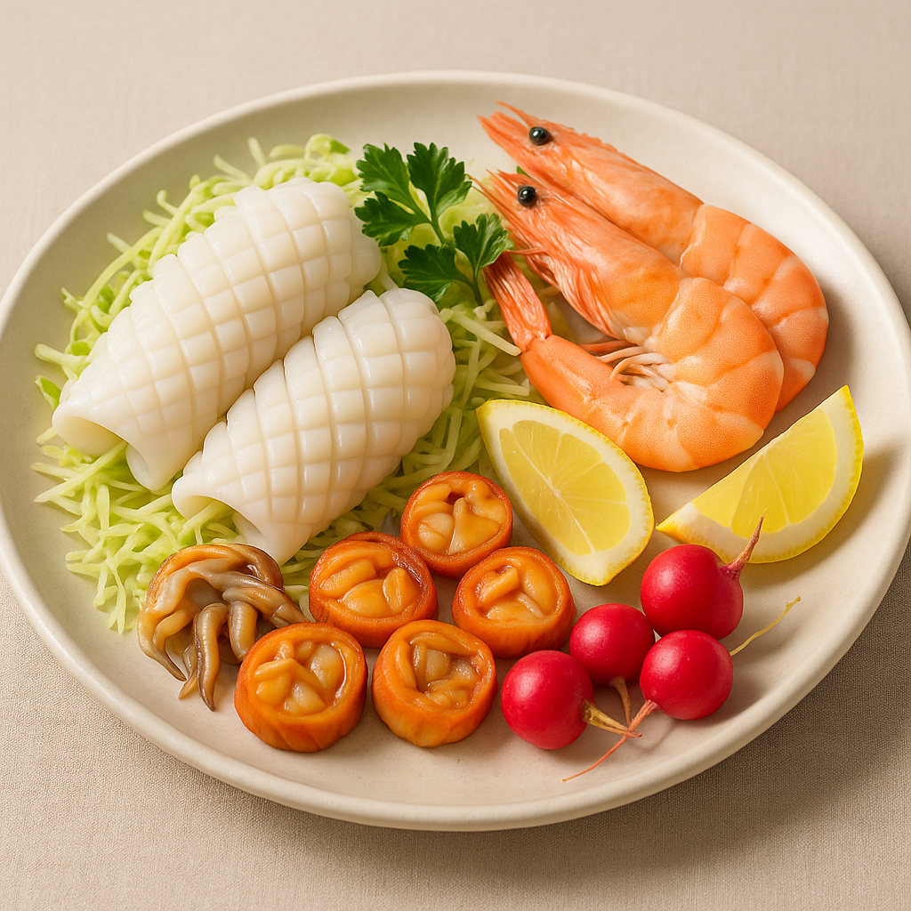 쫄깃한 오징어와 탱글탱글한 새우, 고소한 멍게까지! 세 가지 해산물을 담은 감성 숙회 요리